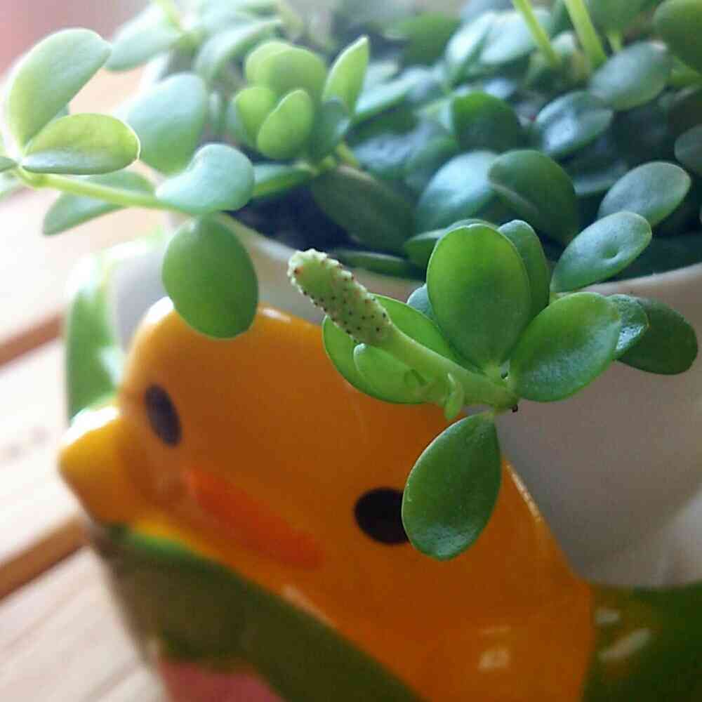 〈ペペロミア〉サン はピヨピヨちゃんの頭に髪飾りを付けて「可愛らしく」してあげたみたいよ😃💕親切だね♪