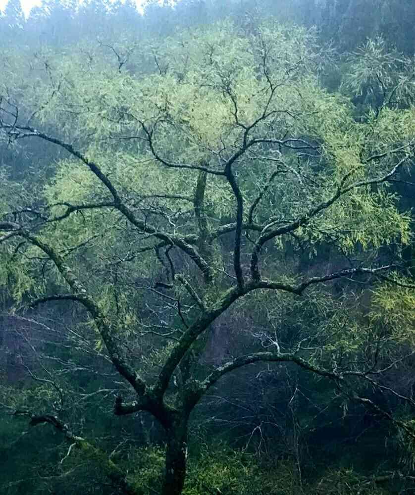 春の雨と霧のこんな日は一層新芽の色と幹の美しい動きが際立つ