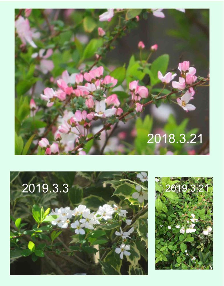玄関前のピンクユキヤナギの花、今年の花と比較してみた!