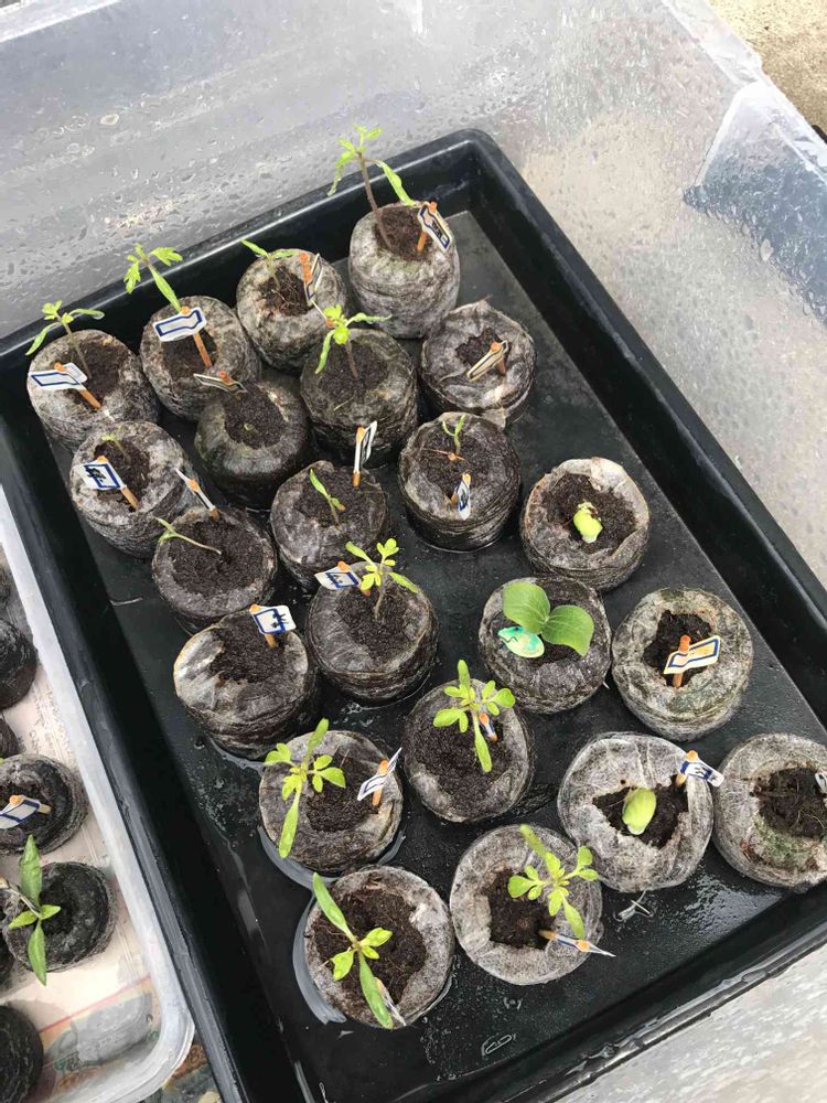 ジフィーセブンで育苗中のトマトの苗たち。本葉が出てきたのでポット上げします。