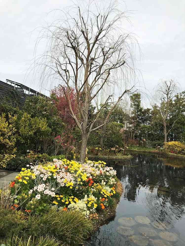 池袋西武デパートの空中庭園 柳の木はまだ眠ってますが足元の花々の見事なこと🌹🌺🌼