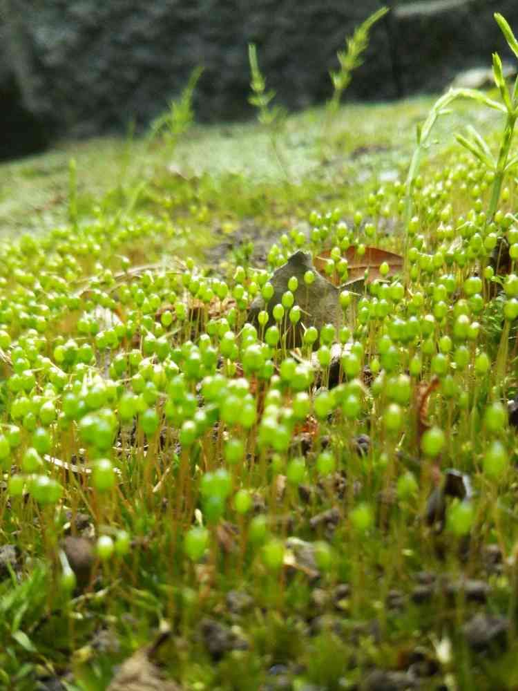 ♬ どこまでも~ 野を越え、山越え~新宿越えて~♬ 続きますね~。サヤゴケ?でしょうか?たくさんの咲くがぎんなんの実のように綺麗な薄緑ですね。