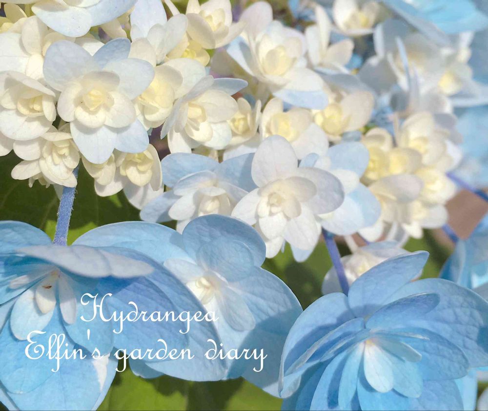 ガクアジサイだけど…ブーケのように真ん中が小さい花がたくさん。今の所、枝によって真ん中の花が白だったり、ブルーだったり、色も違っていて凄く可愛いです💕