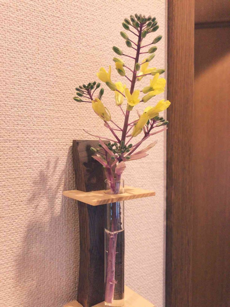 庭の葉牡丹に菜の花が付いていたので一輪挿しへ投入