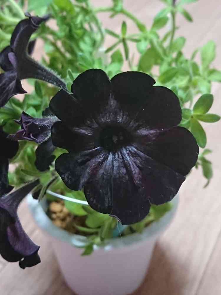 様 ありがとうございます!去年ペチュニァのナイトスカイと言う紫と白のペチュニァにとある(秘密)黒い花の交配受粉をしてみたところ、室内での一年がけでの完成品ですー夜は真っ黒のベルベット、朝は赤むらさき二色見れて幸せです