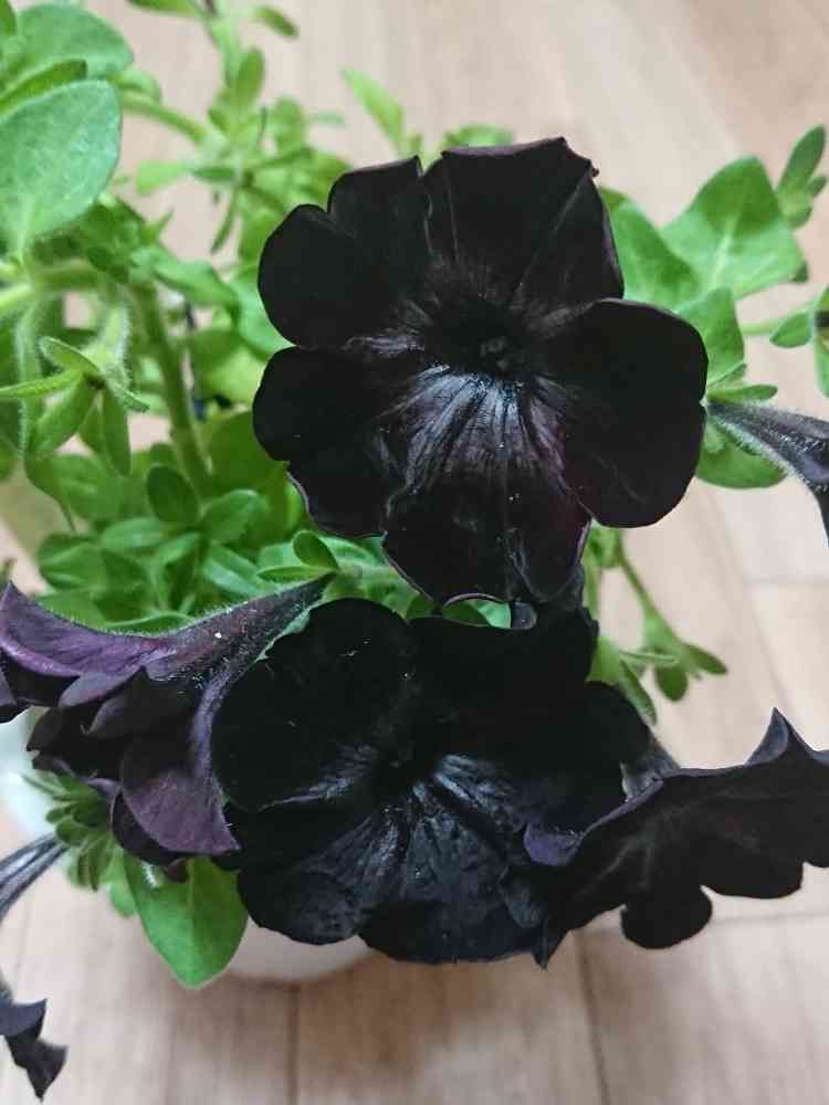 黒い別のお花から雄しべと雌しべを、いただきまして去年種を埋めたところ(室内)見事に三株生まれたのです!ペチニュアは、品種改良個人でもできるから楽しいですよ!