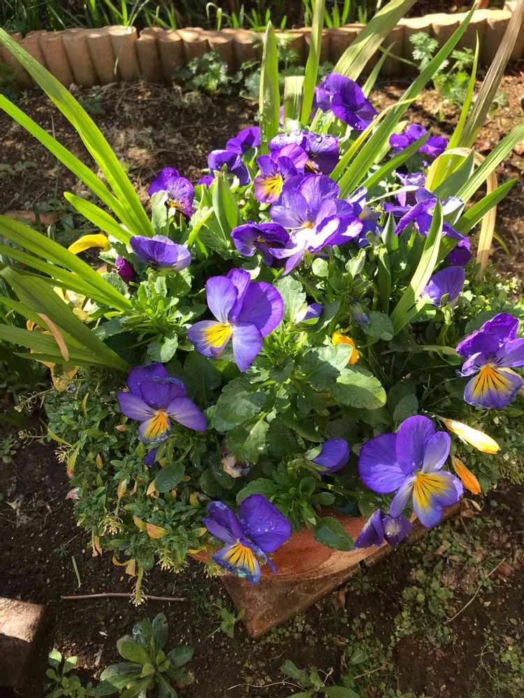 チオノドクサとチューリップとフリージアの球根を入れて、上にパンジーとアリッサム。