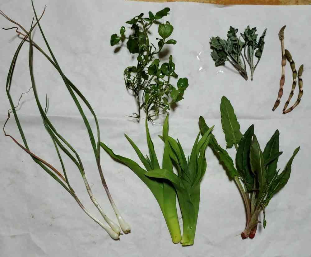 左から時計回りにノビル、クレソン、ヨモギ、ツクシ、スイバ、カンゾウです。