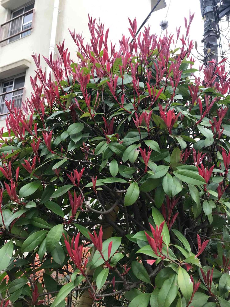 シキミのような緑の葉っぱから、また赤い葉っぱ?出てきている。