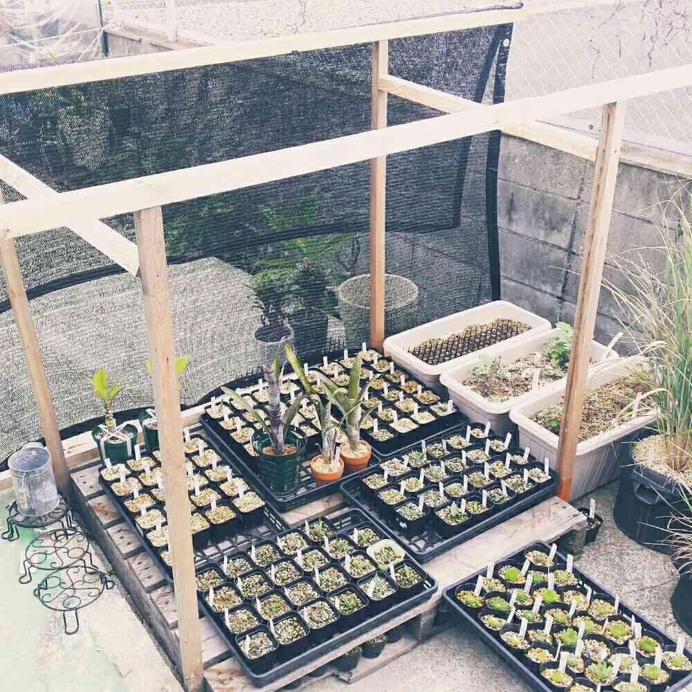 私設ナーセリーの一部に掛けていた遮光を外しました。直射、台風、どんと来いです(°▽°)