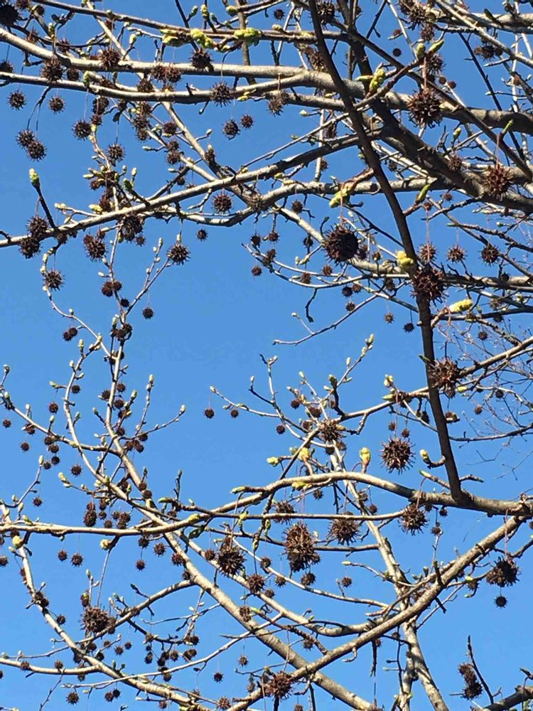 実の残るアメリカフウの木にも新芽が。