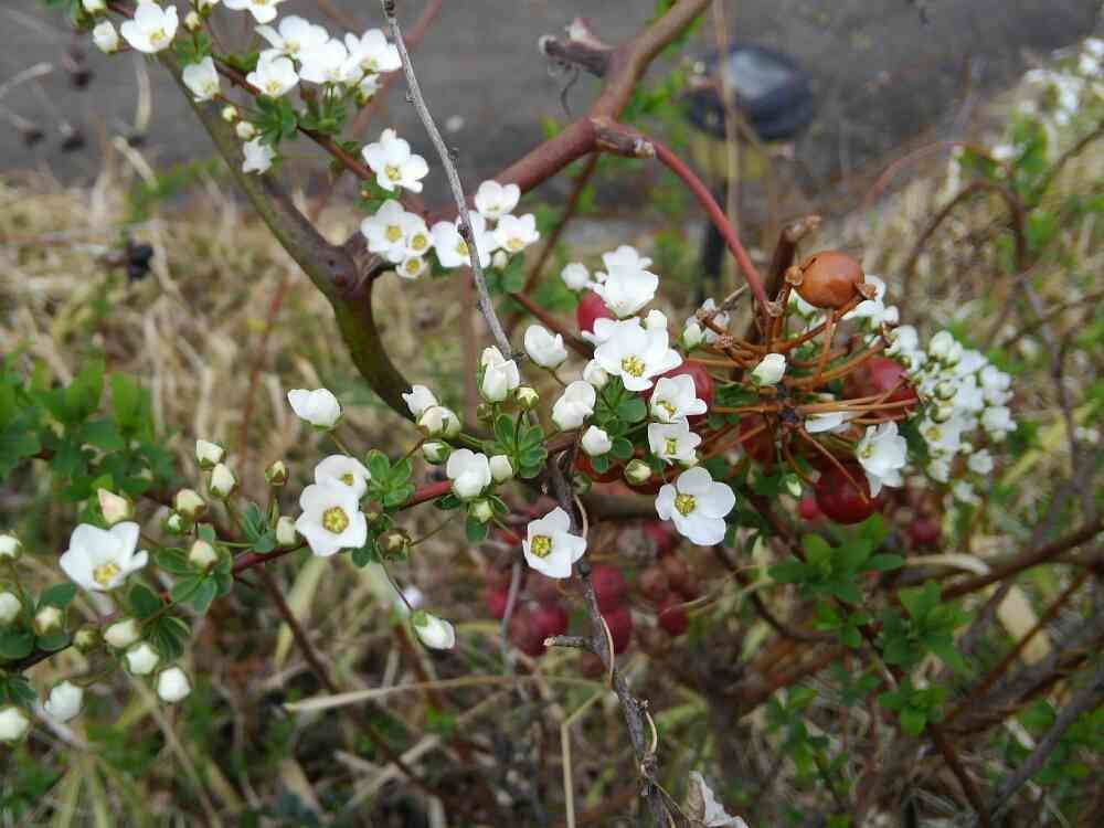 町内の街路樹の下のユキヤナギも、同じく今日、一気に咲き揃ったので、