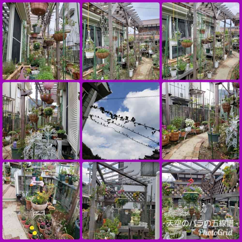投稿写真は、上段と中段左は、第三パーゴラの風景です。なんとハンギングバスケットが19もありました。工夫によれば。もう10ぐらいは、ハンギングできそうです。