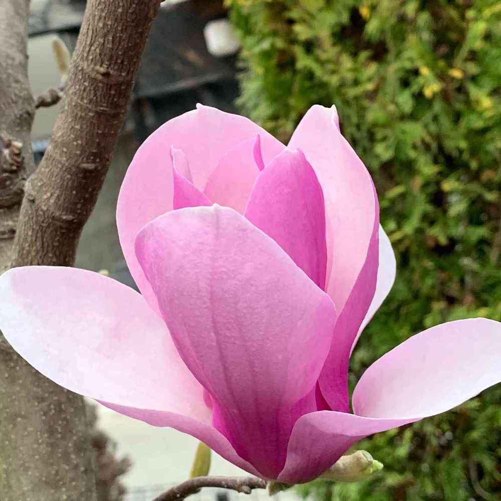 このモクレンは外はピンクで中は白い花びらで大きな花が特徴です😊先週が満開でしたがすでに散り始めました😃