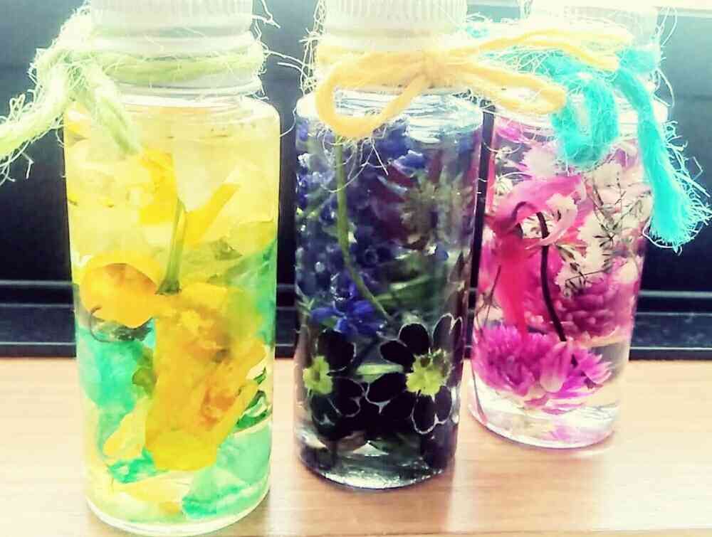 はじめてのハーバリウム、水仙、水色スイートピー、ポリアンサ、ムスカリ、ガーデンシクラメン、千日紅、かすみ草、