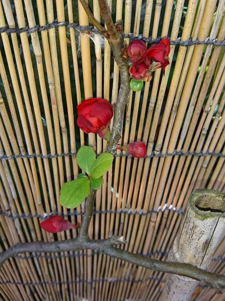 こんにちは☺️ やっとボケの花が咲きました‼️ 盆栽で伸びきって日陰に置いてありました❗