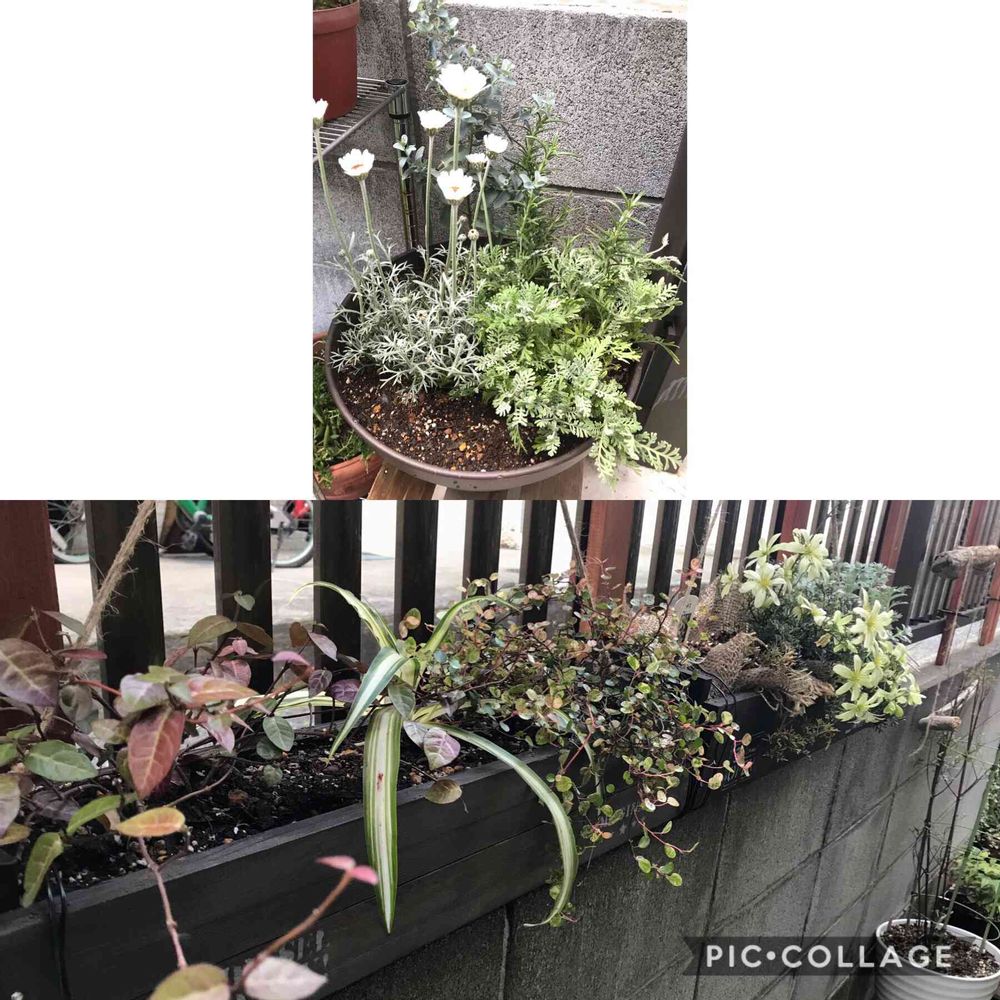 家にあったハツユキカズラ、オリズルラン、買ってきた斑入りのワイヤープランツで以前作った黒のプランターへ寄せ植え。
