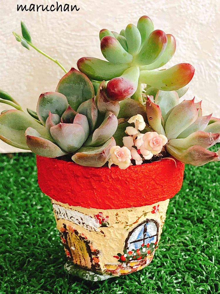 私は寄せ植えが苦手なのね😊💨 リメ鉢にカット多肉ちゃん乗せてるだけ笑 ミニチュア鉢で作ってみたの お家鉢 屋根も描きたかったけど今のところ思案中〜💗 誰か屋根 こうしたらって 教えて😃✨ 思いは、コテージガーデン本店イメージ編