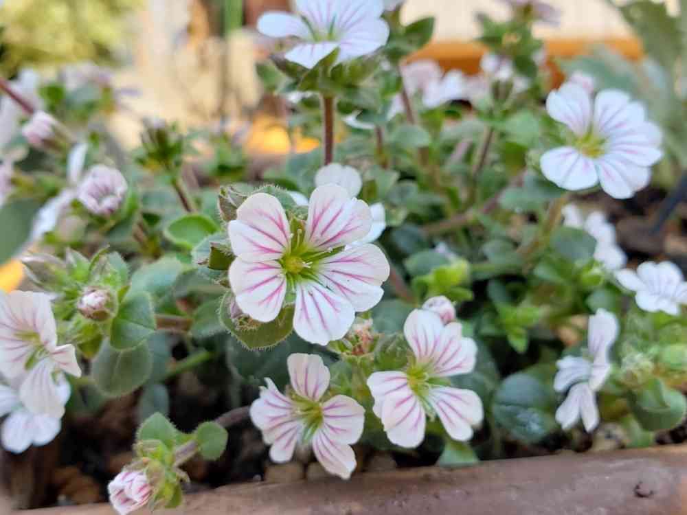 アークトチス ダークワインの足元に、白い花びらに赤紫の筋が入ったこのコを選んでみました。