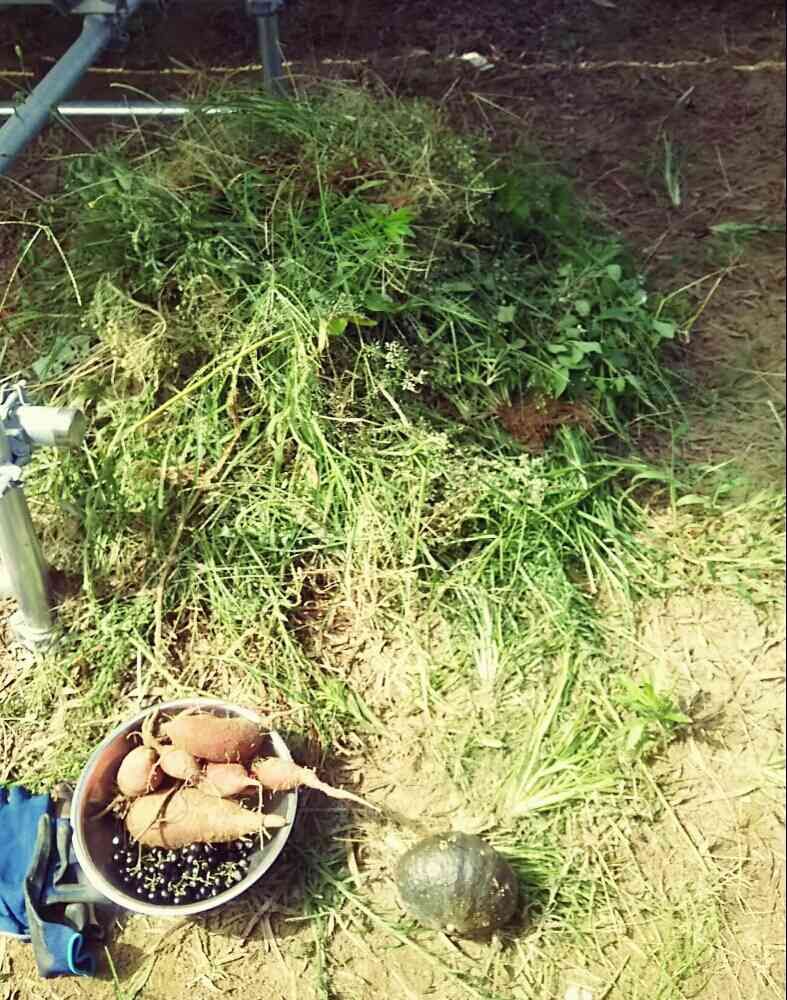 初収穫のサツマイモ(シルクスイート→すごく甘い✨)。ハックルベリーとカボチャも。