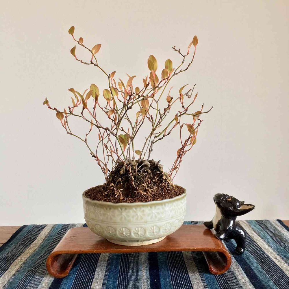 山帰来(サルトリイバラ)の芽出しです。根元の株が岩のようになるのが面白いですね。20年くらい前に山採りしたものです。樹高12cm。