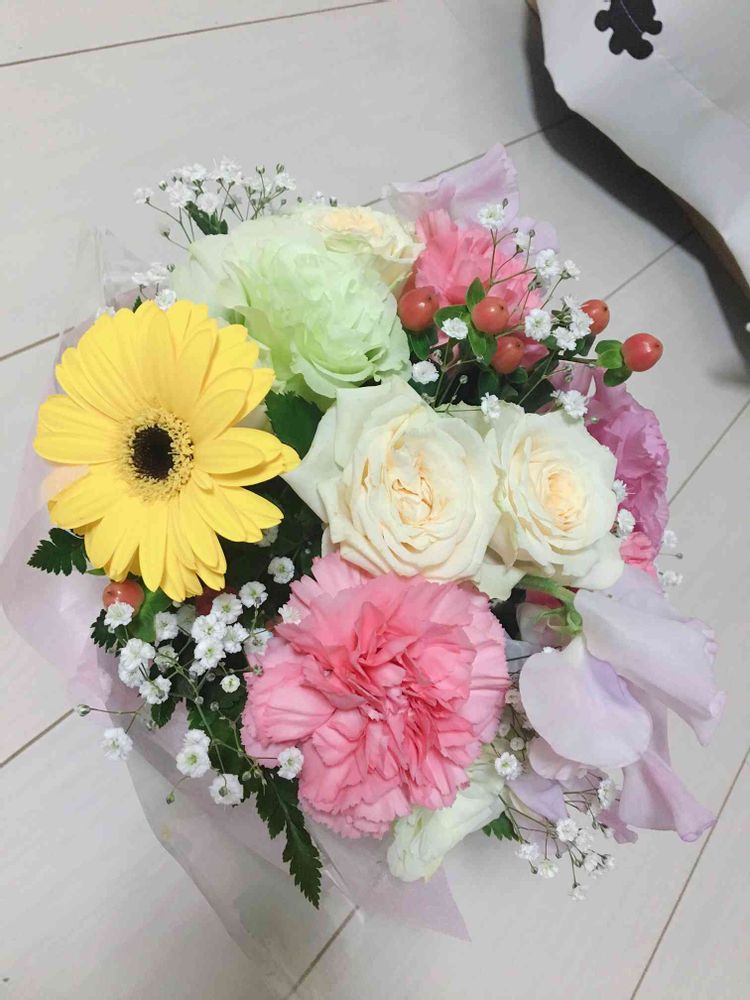 初めまして(*^^*) 優しい色合いの素敵な花束ですね💕 お仕事お疲れさまでした😌