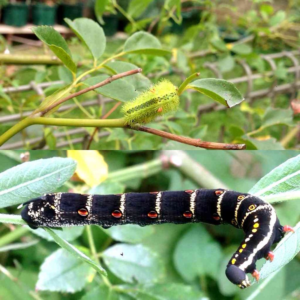 下のクロちゃんはスズメガの幼虫ですね。親戚筋のキミドリちゃんが道路を這っていて色と大きさに驚いてしまいました😄💦この子は毒がないみたいですね。