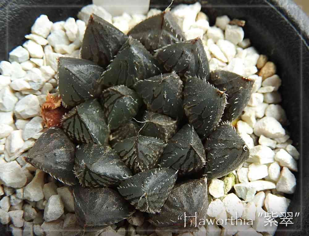 「紫翠」の札がついているけど、この名前で検索しても似たのがヒットしてないので、実は謎ハオルチア。ミラーボールに似てるかと思ったけどそうでもないみたい。特徴は日に当てると黒っぽいいろになること。いつまでもぺったんこなこと。オブツーサでも真ん中が盛り上がったドーム状に成長するけど、これはいつまでたってもぺったんこ。