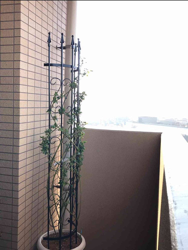室内で少し低いオベリスクに巻きつけて、比較的風が緩いサブバルコニーへお連れすることにしました。