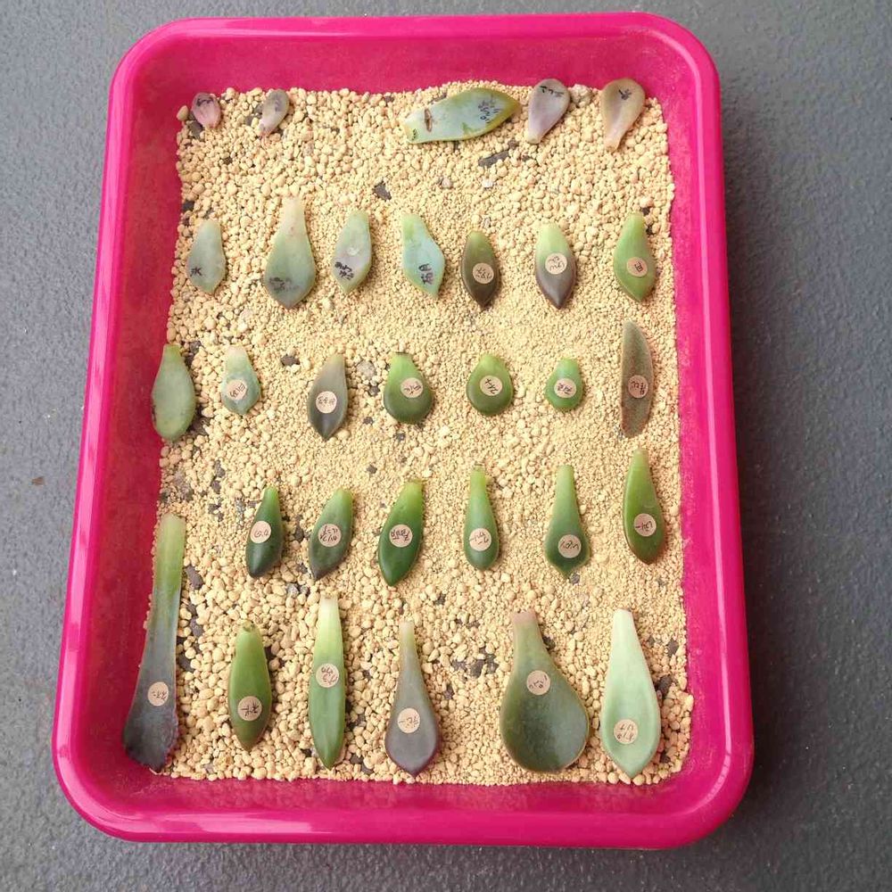 百均トレイに多肉土、オルトラン、多肉土、オルトラン、鹿沼土の微塵とその上の小粒をばら蒔いて、譲って頂いた葉を並べてみた。