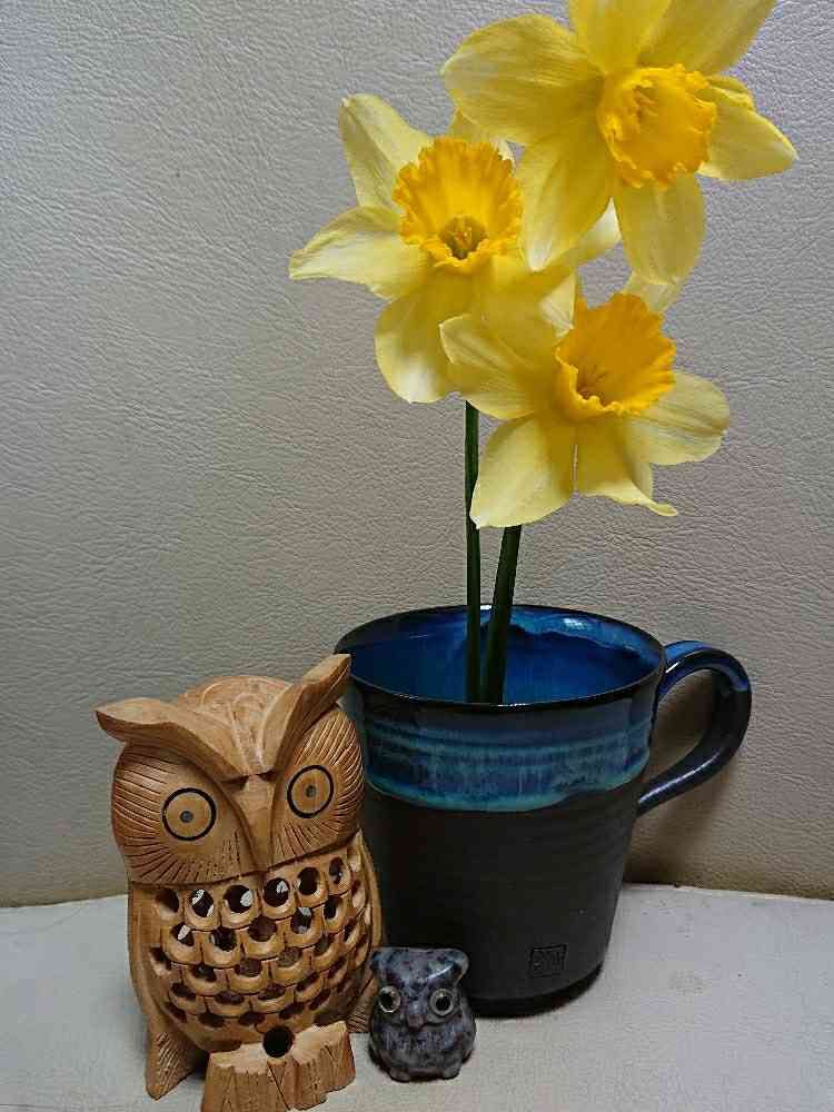 わかりづらいかも知れませんが、木彫りのフクロウのお腹のなかに、もう一羽赤ちゃんフクロウがいます🦉💕
