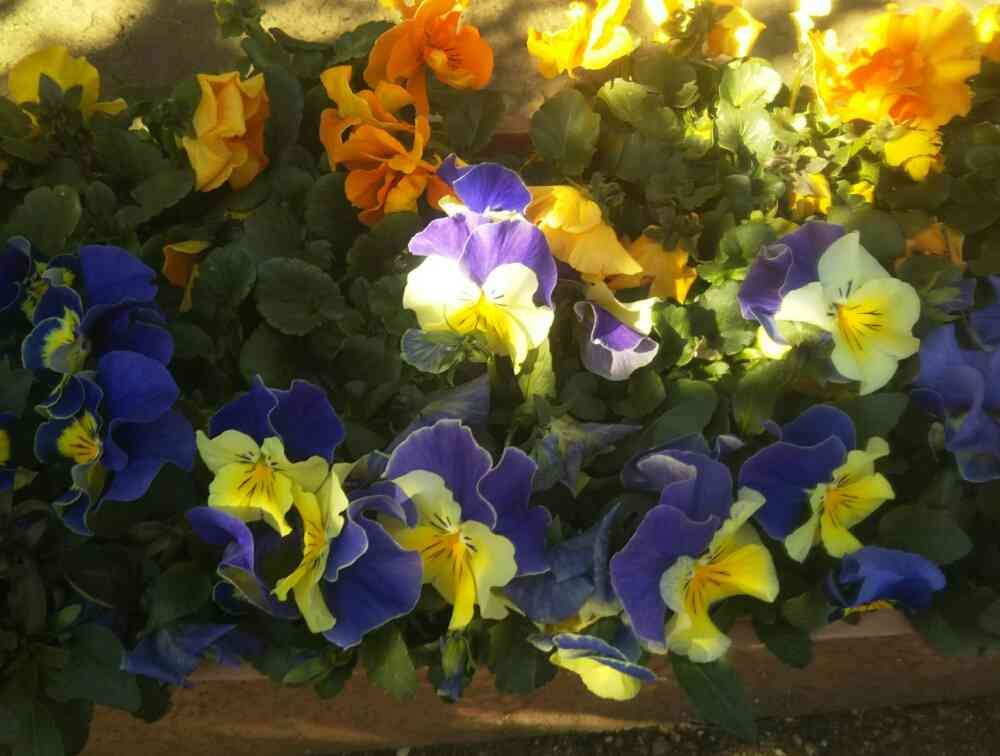 前列と後列に2種類のパンジーを植えてあります。前が、ブルーと黄色のツートンでインパクト強いので、後ろは優しいフリルのオレンジです☀