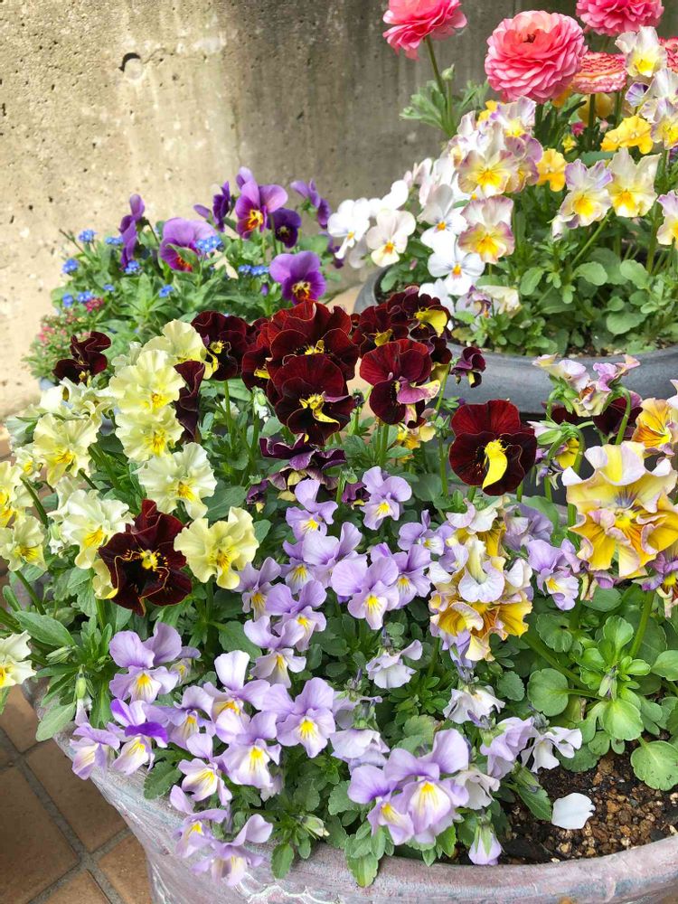庭人さん苗のビオラを集めた中に、rokaさんビオラの小さめレディを加えた寄せ植えです😊モリモリしてきました♪̊̈♪̆̈
