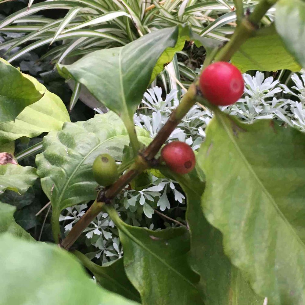 種を撒いてはや数年、ついに赤く色付きました。これがコーヒーの実です🎶