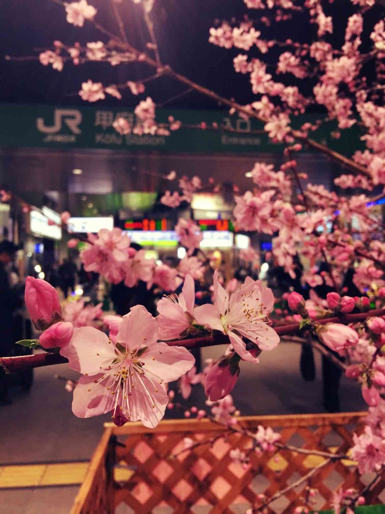 甲府駅まえの、夜桜でしよーか🌸色が濃くてきれいですね😊