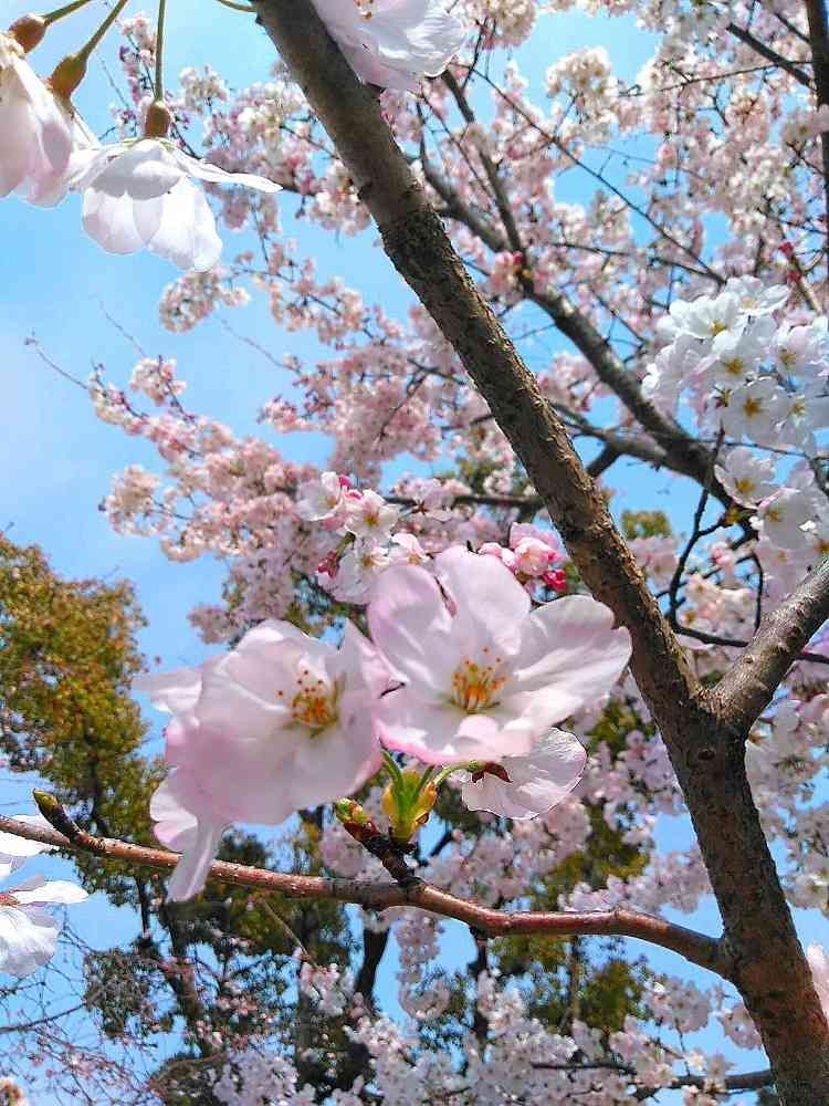 ソメイヨシノに比べると、大きめな花。少し、濃いめのピンクが混ざってる花びら。そして、満開。ソメイヨシノはまだ一分咲き程度。