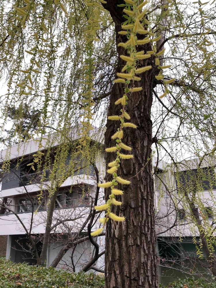 3/30 朝 夙川公民館にグリーンの木の花が咲いていました。