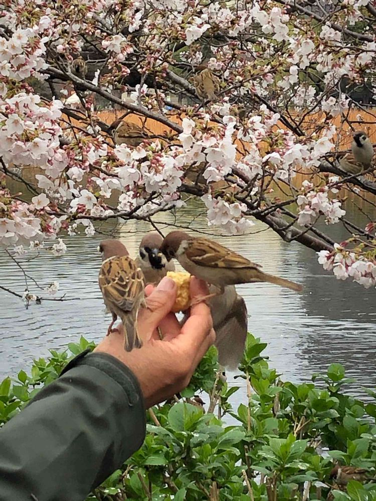 桜とスズメを手懐けてる人…