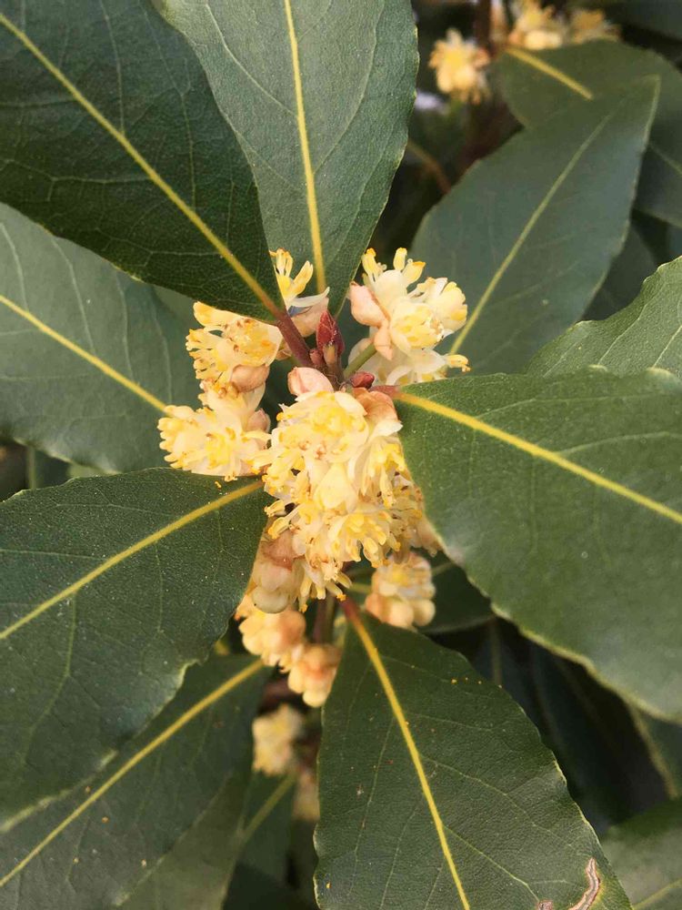 月桂樹の花と葉🤩 今にも枯れそうな木でしたが、今年初めて花が咲きました。元気になって良かった💚💚