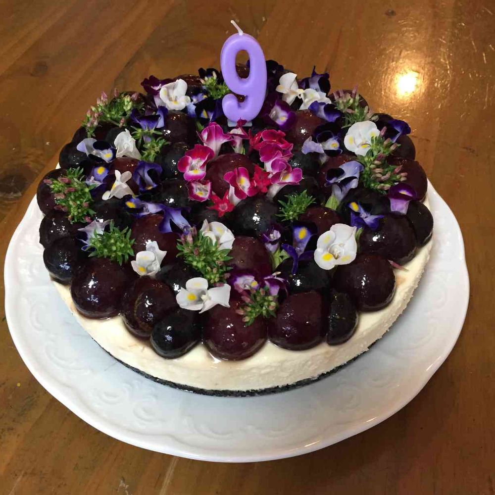 娘のお誕生日ケーキ♡ブドウ狩りしたブドウと食用花をデコレーションしました。