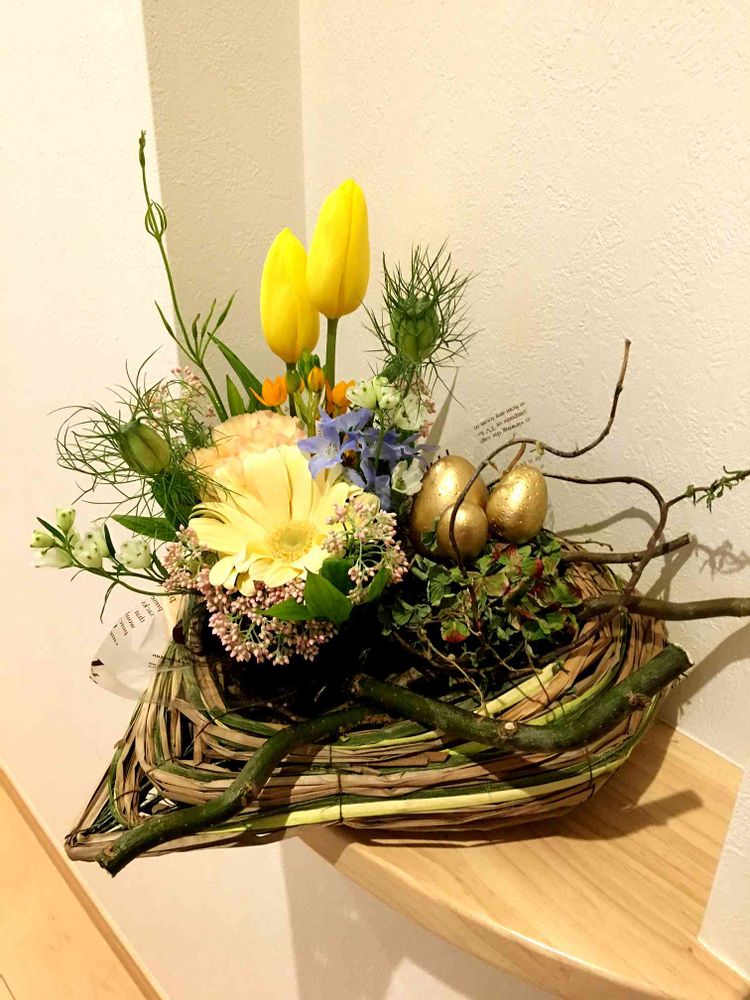 雲龍柳を鳥の巣に見立て、アンティークアジサイの上に金色のたまご🥚✨
