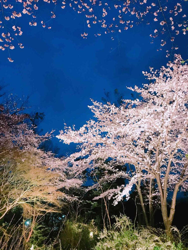 よく晴れた夕方暗くなりかけた頃の空の色と桜のピンク🌸が幻想的でした。