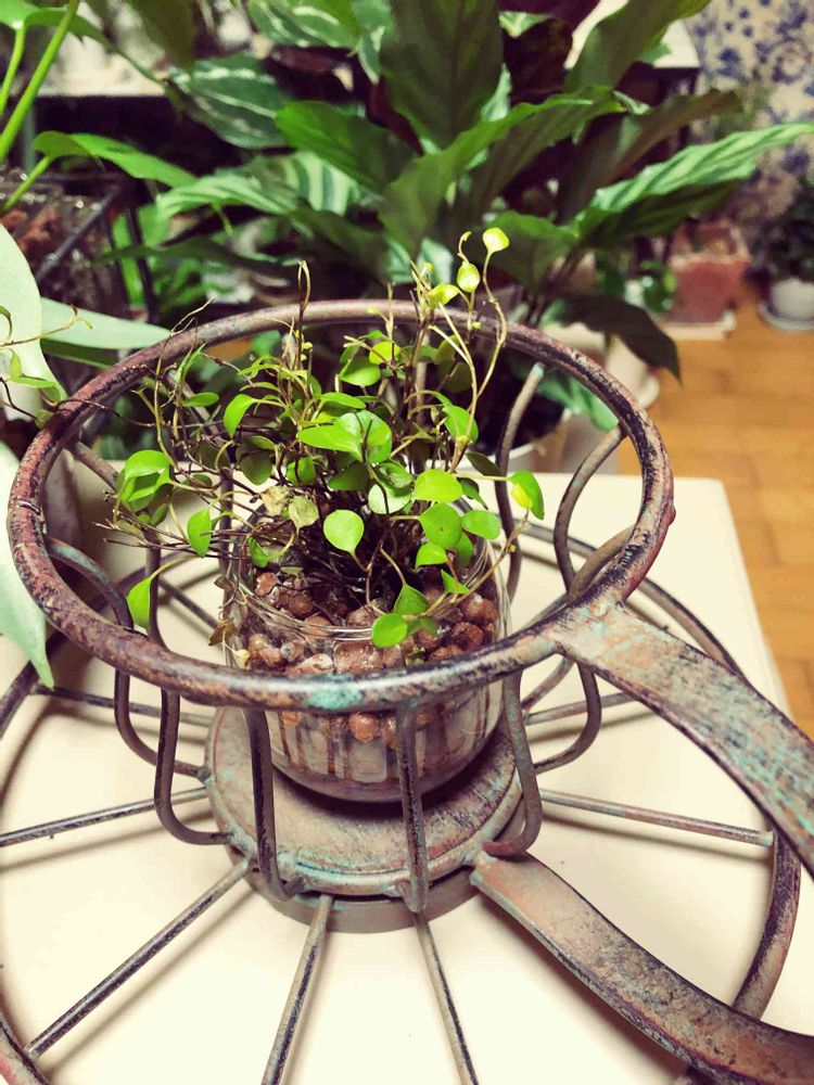 ニャンコのサラダバーになっていたワイヤープランツ。結構繁っていたのに、かなり食べられてしまったので移動。檻っぽいアイアンの中に入れてみました。この場所がネコにバレるまで、どのくらい時間が稼げるかわかりませんが、復活して頂きたいところです。