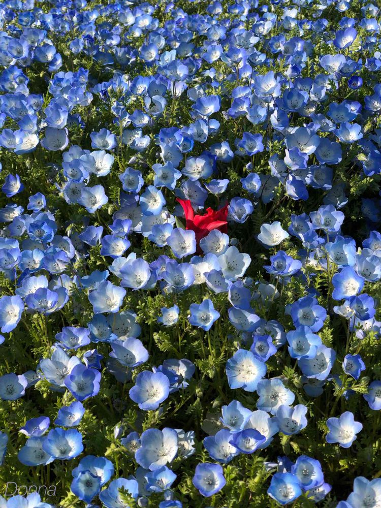 ブルーのネモフィラの中赤い花は チューリップ🌷?かしらブルーの絨毯ですね💞