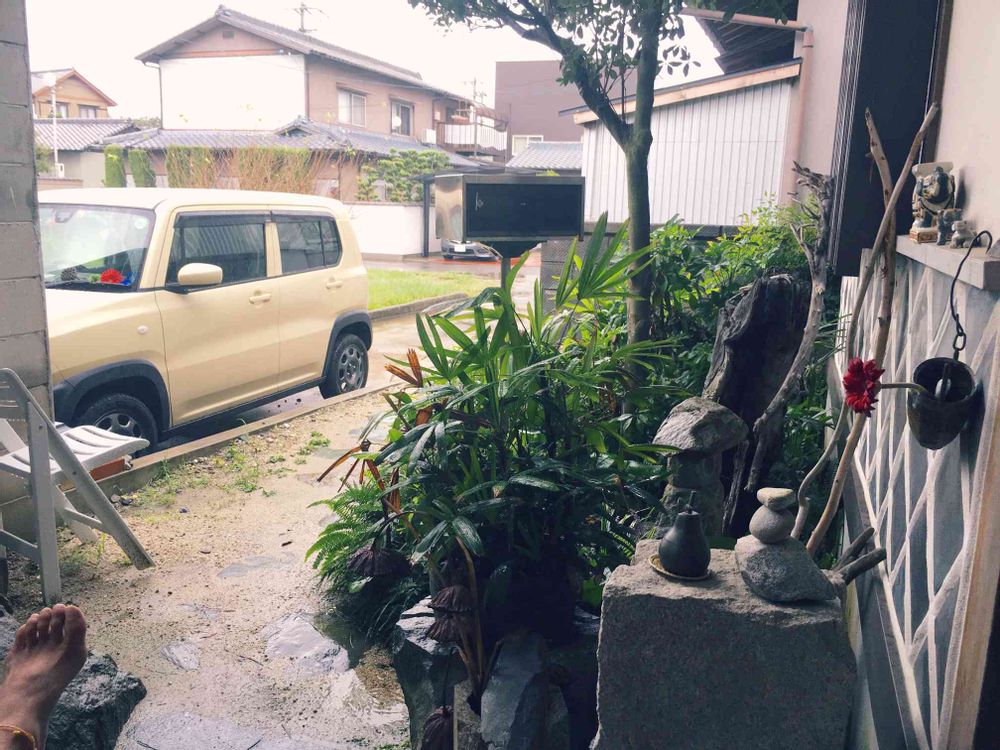 用事も終わりなランチ後、玄関で”秋の長雨”を愉しんでおります。