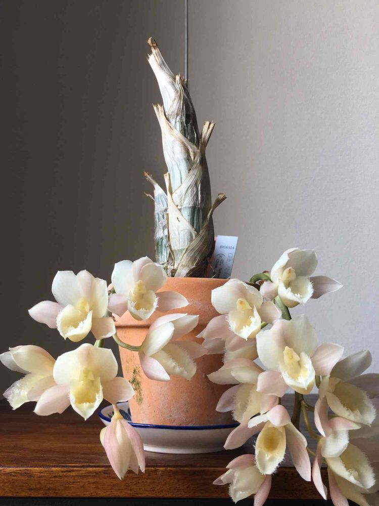 白ともクリームともピンクとも言えない色に癒されてます。交配種なので、カタセタムにしては花持ちも良いですよ。