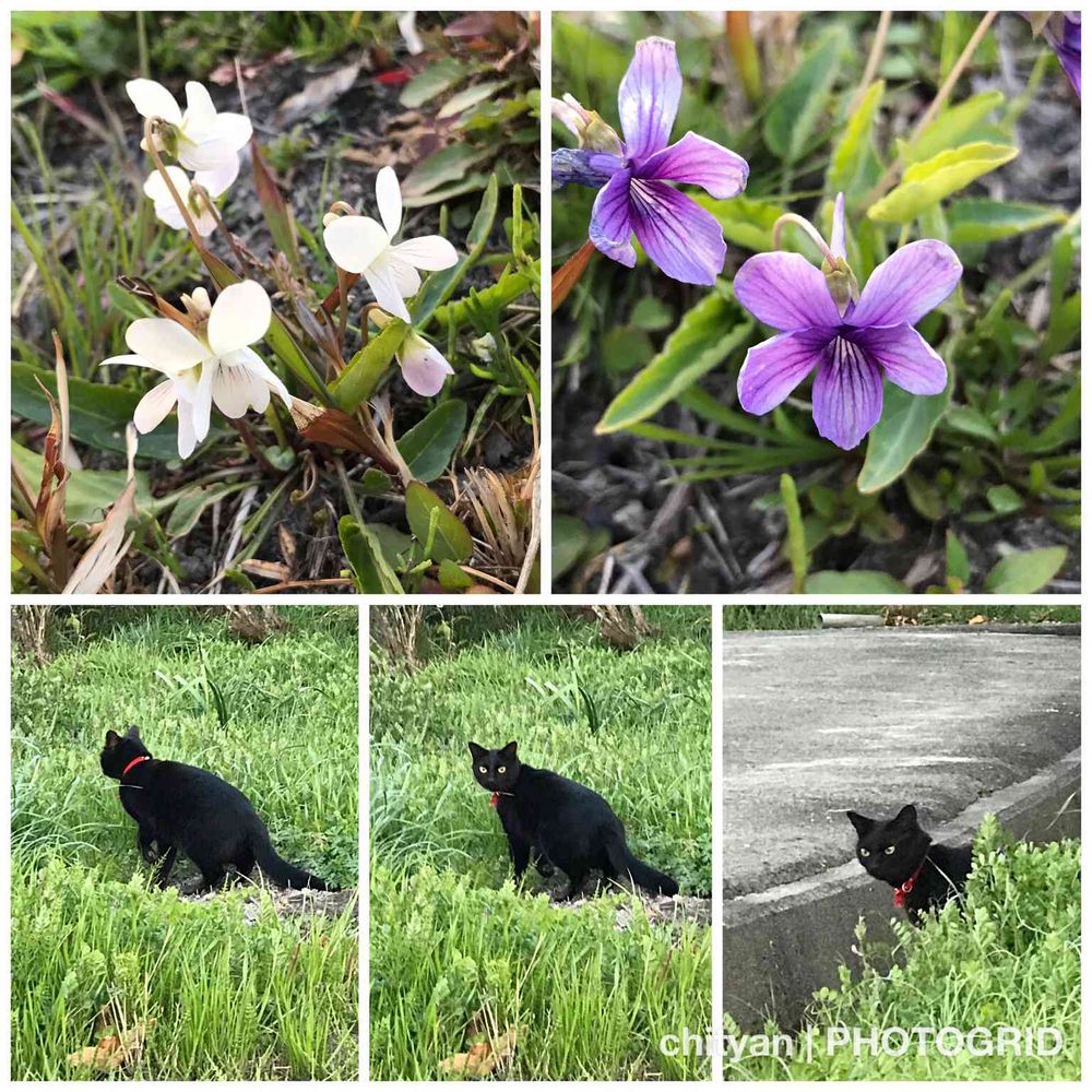 今日の夕方のお散歩で出会った菫と黒猫ちゃん。
