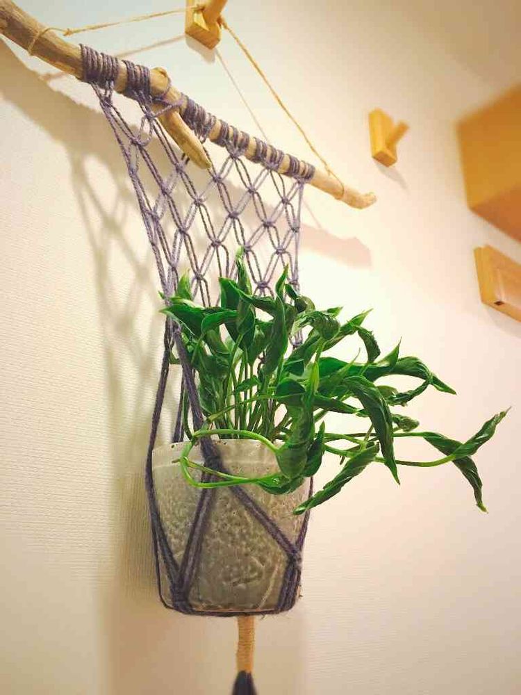 流木と紐さえくくりつけてしまえば、普通のプラントハンガーより編むところは少なめでした☺︎