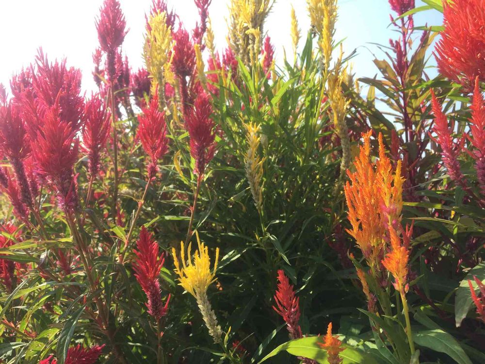 鶏頭花橙赤黄背比ぶ