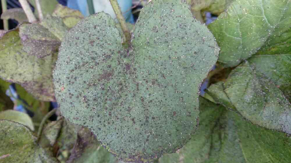 メロンのころたんの葉が、気がつけばこんなに黒く汚れのような感じでなり、でも表面には白いつぶつぶしたものがたくさんついています。